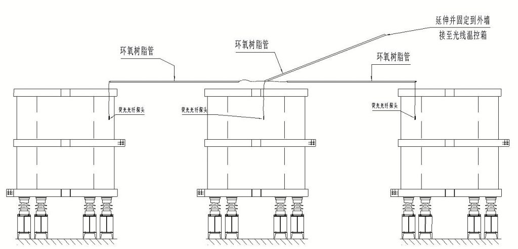 熒光式光纖測(cè)溫終端嵌入安裝在箱體,引出的光纖往墻體上部走,高度需要超過電抗器高度,經(jīng)過安裝在墻壁的環(huán)氧樹脂管,三根光纖匯總進(jìn)入B相電抗器;B相光纖直接安裝在電抗器內(nèi)部氣道壁內(nèi);A、C兩相分別經(jīng)過架空絕緣的環(huán)氧樹脂管引致A相、C相電抗器,安裝在電抗器內(nèi)部氣道壁內(nèi)。